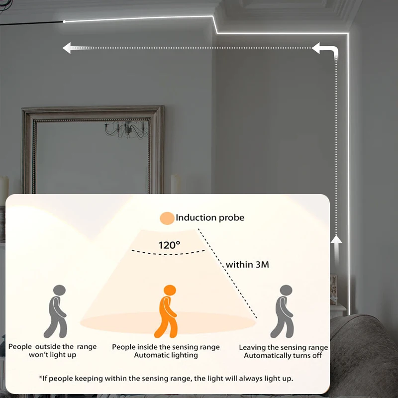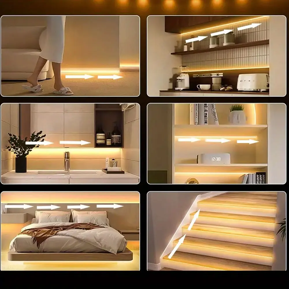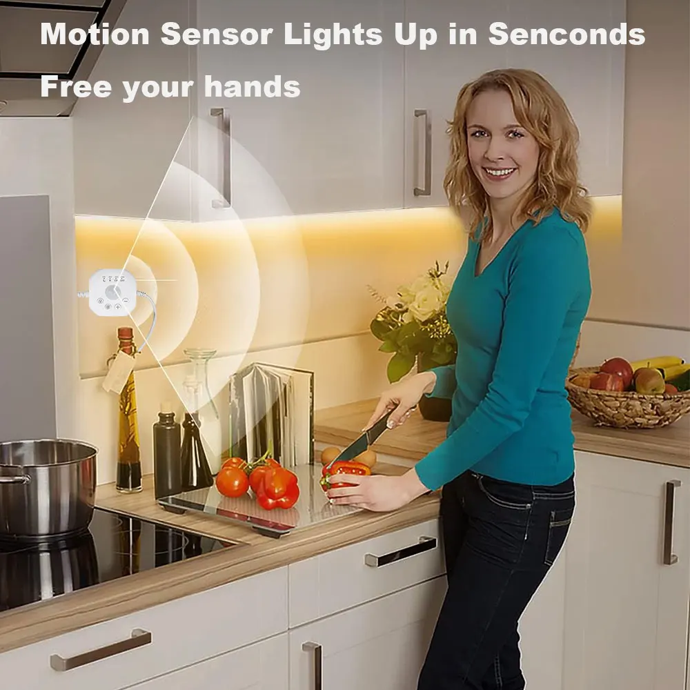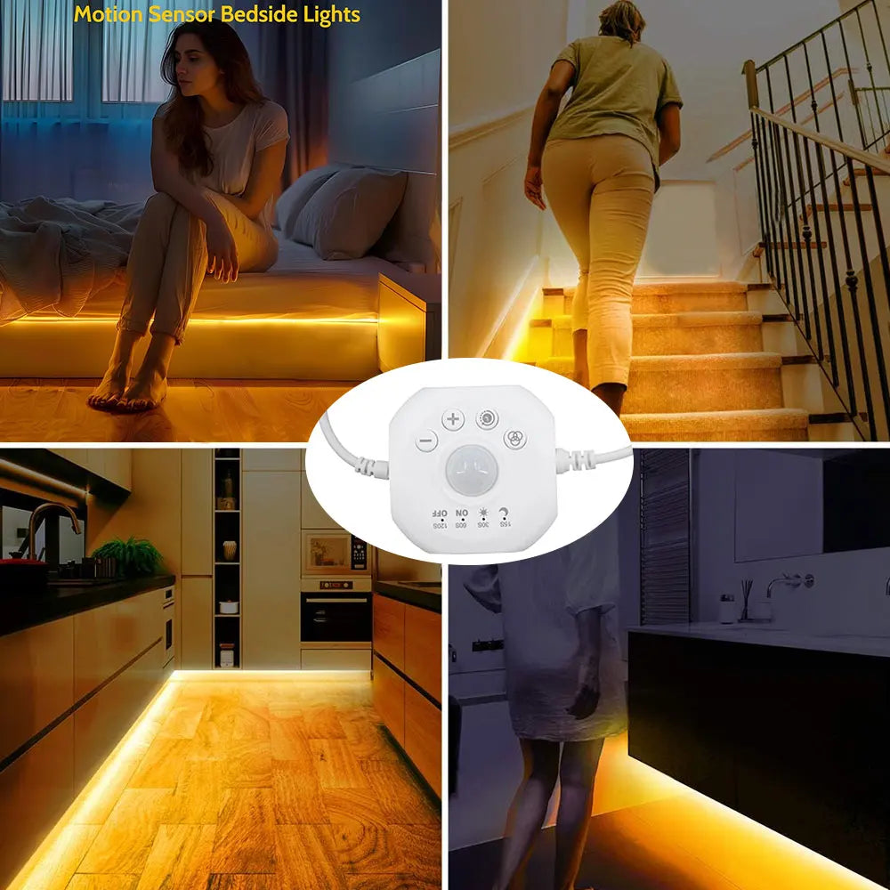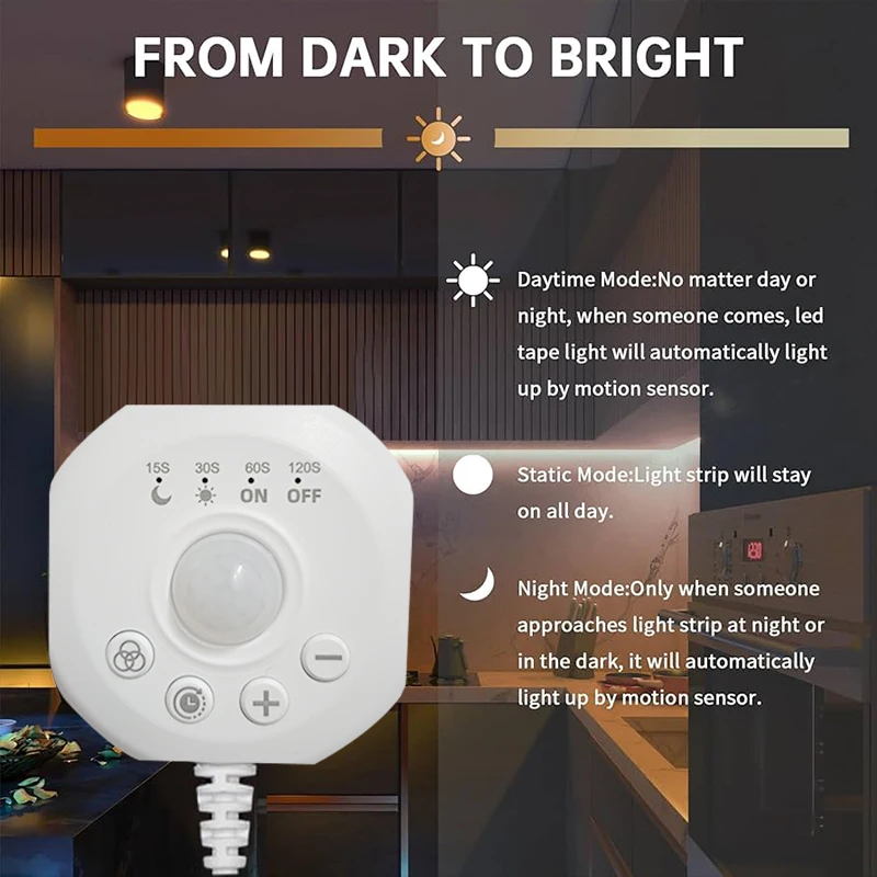【Always On Warm White Motion Sensor Led Light Strip 】 In addition to the motion sensing mode(Moon), there is also provide "always on" mode(Sun). Provide you with continuous, stable and warm lighting with motion sensor closet lights. Great led closet light motion activated mood lighting led lights for bedroom, kitchen, living room, cloakroom, wardrobe, hallway.
