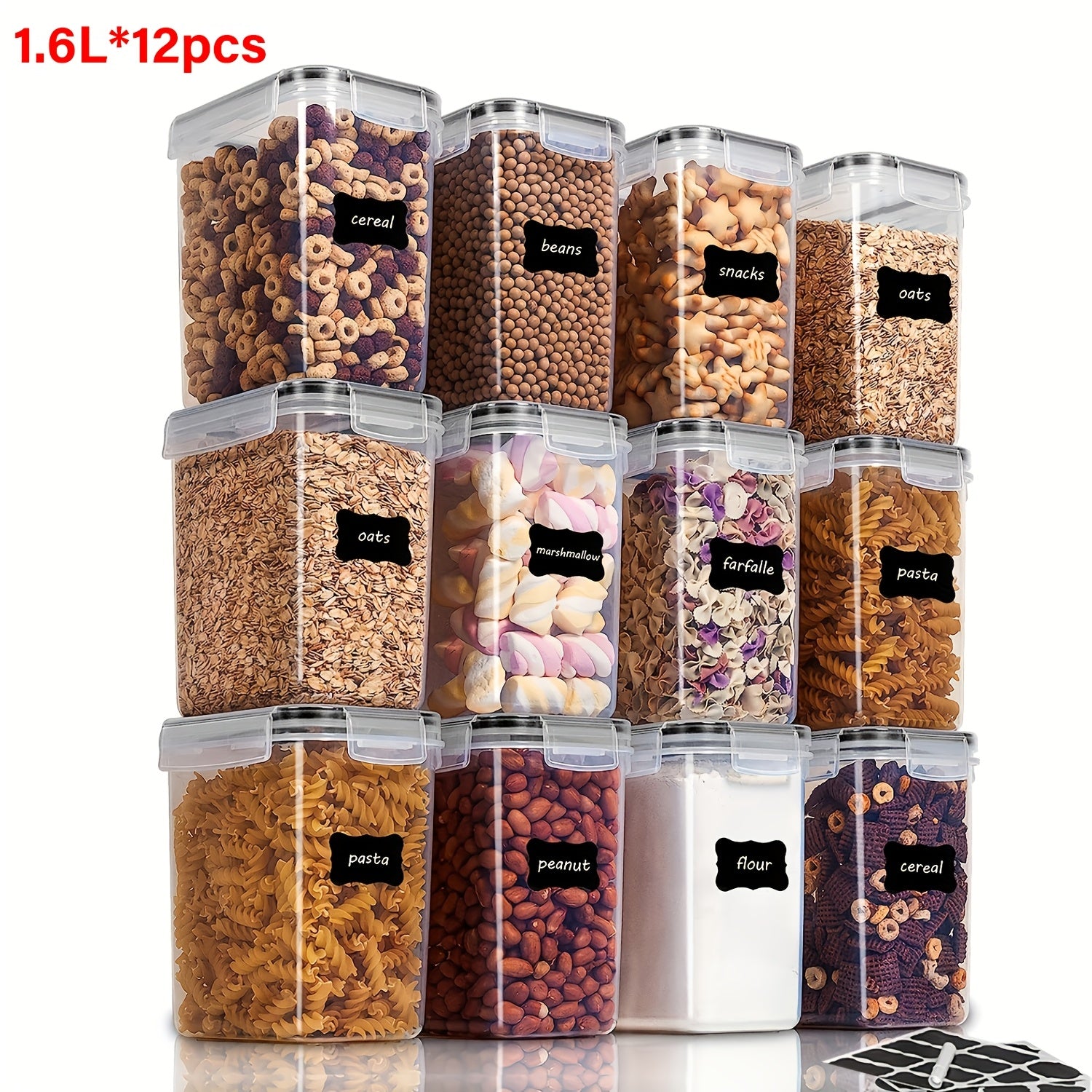 Ideal for organizing your pantry: This set features 12 airtight containers (1.6 liters/54 oz), suitable for keeping baking ingredients, oats, pasta, rice, flour, sugar, coffee, tea, snacks, nuts, and even a small cereal box. It arrives in an attractive package, making it a perfect gift for friends or family.